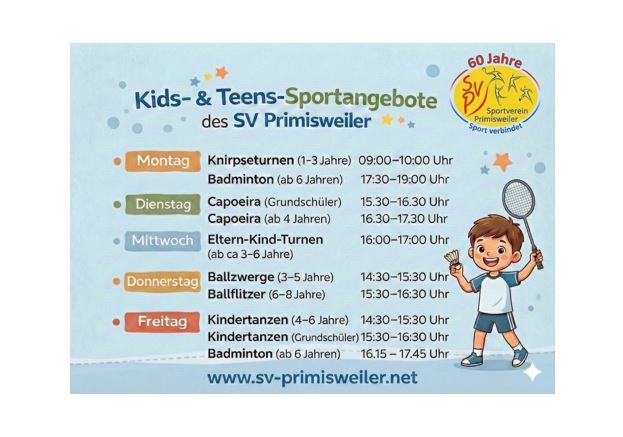Einladung zum Kinderfaschingball in der Sporthalle Primisweiler am 07.02.2026 Es ist wieder soweit, die fünfte Jahreszeit ist in vollem Gange! Wir laden euch deshalb herzlich… Weiterlesen »Kinderfaschingball in der Sporthalle Primisweiler am 07.02.2026