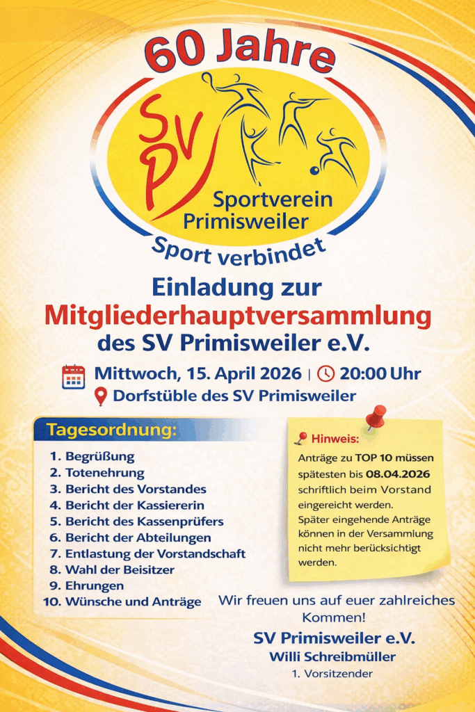 Anträge zu Top 10 müssen spätestens am 08.04.2026 schriftlich beim Vorstand abgegeben werden. Später eingehende Anträge können bei der Versammlung nicht mehr berücksichtigt werden.