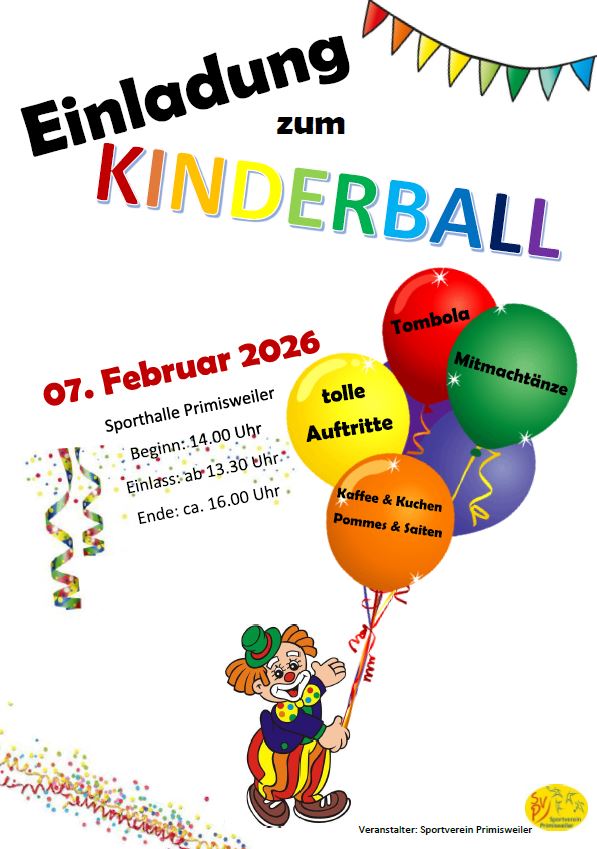 Wir laden euch deshalb herzlich zu unserem Kinderfaschingsball am 07. Februar 2026 von 14:00-16:00 Uhr in der Sporthalle Primisweiler ein. Freut euch auf einen bunten und fröhlichen Nachmittag voller Spaß, Musik und guter Laune. Natürlich gibt es auch wieder tolle Auftritte der Kindersportgruppen unseres Vereins für euch. Seid gespannt und schaut vorbei. Wir freuen uns auf viele kleine und große Narren.